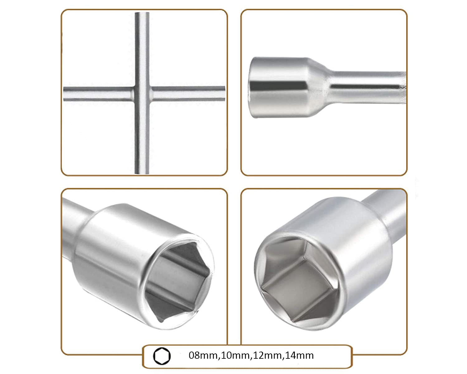 The Custom Accessories 4-Way Lug Wrench is an excellent addition to your home toolbox. It is ideal for tightening and loosening stubborn bolts. This 6" lug wrench includes 08mm, 10mm, 12mm and 14mm heads, making it suitable for a variety of tasks.